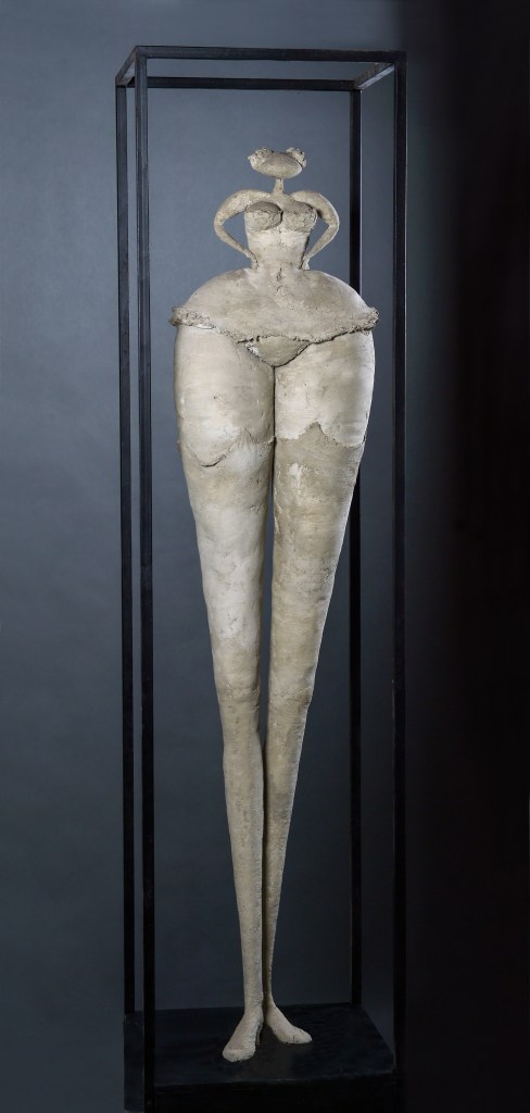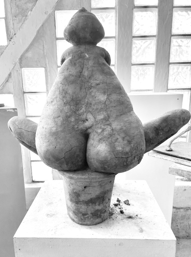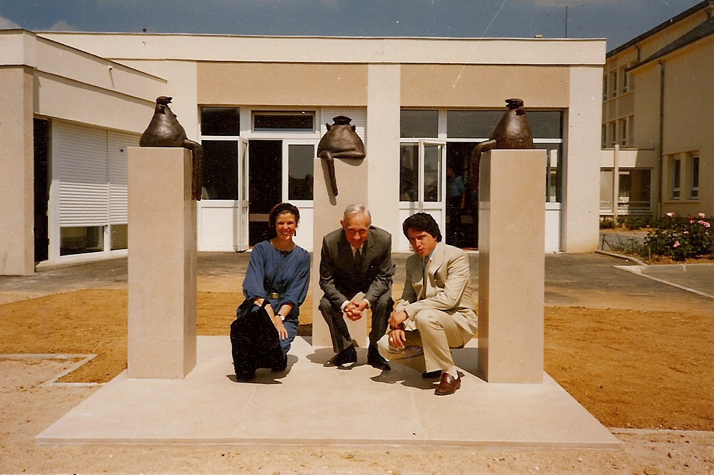 Le ciment s’arme, les formes végétales deviennent des personnages hybrides et joyeux et s’animent. Ainsi trois grenouilles humanoïdes conversent à l’entrée du collège Alphonse Kharr de Mondoubleau depuis 1981.
