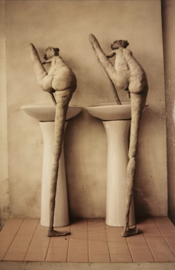 Dans La Toilette les membres s’allongent, la tête se forme les êtres deviennent homme et femme dans leur environnement quotidien. Activité banale et répétitive dont des gestes synchronisés se superposent et créent un espace-temps